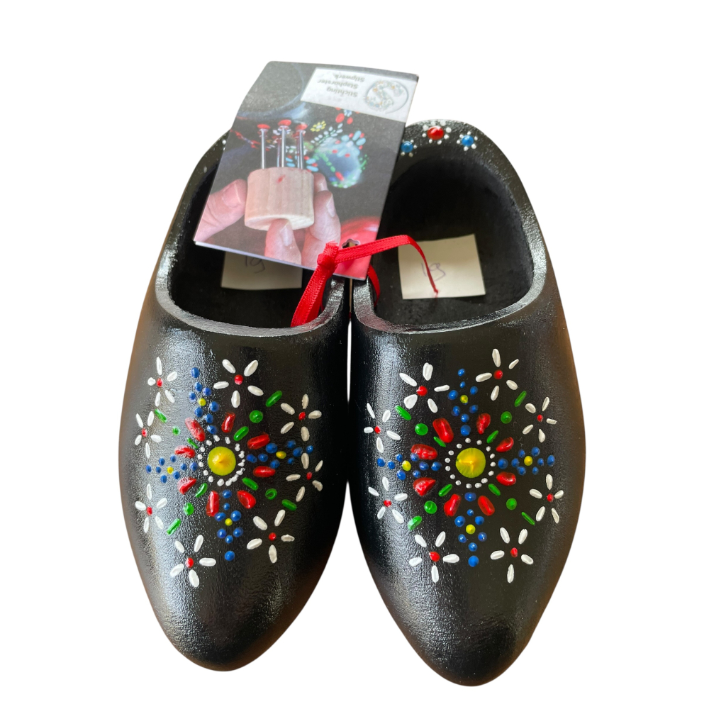 Breng een stukje Nederlandse traditie mee naar huis met deze prachtige draag klompen. Deze klompen hebben een zwarte ondergrond en zijn versierd met traditionele Staphorster stipwerkpatronen, gedrukt met stempels in diverse motieven.