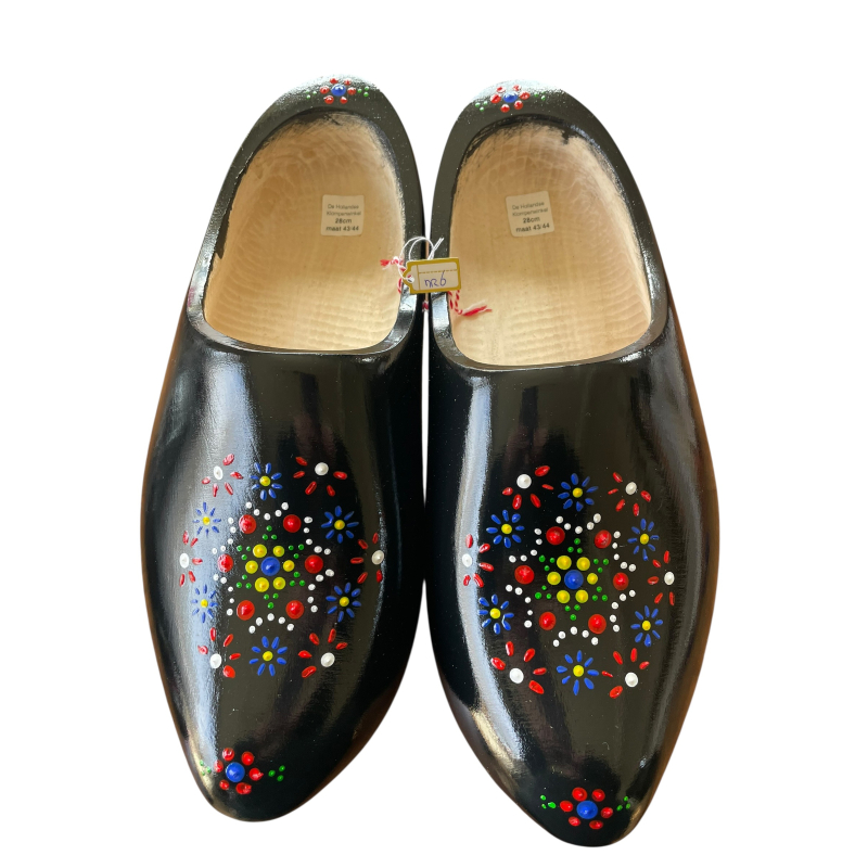 Breng een stukje Nederlandse traditie mee naar huis met deze prachtige draag klompen. Deze klompen hebben een zwarte ondergrond en zijn versierd met traditionele Staphorster stipwerkpatronen, gedrukt met stempels in diverse motieven.