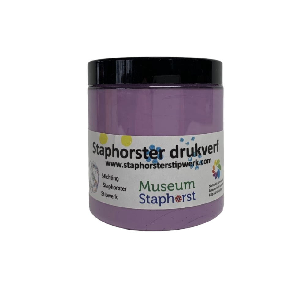 De Staphorster drukverf is speciaal ontwikkeld voor de toepassing Staphorster stipwerk. De basis van deze verf is een hoogwaardig watergedragen PU verf. Dat betekent dat het een waterverdunbare verf is.