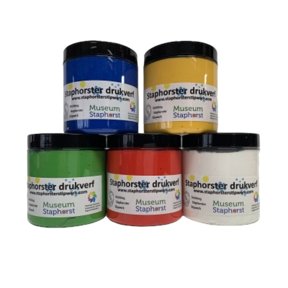 De Staphorster drukverf is speciaal ontwikkeld voor de toepassing Staphorster stipwerk. De basis van deze verf is een hoogwaardig watergedragen PU verf. Dat betekent dat het een waterverdunbare verf is.