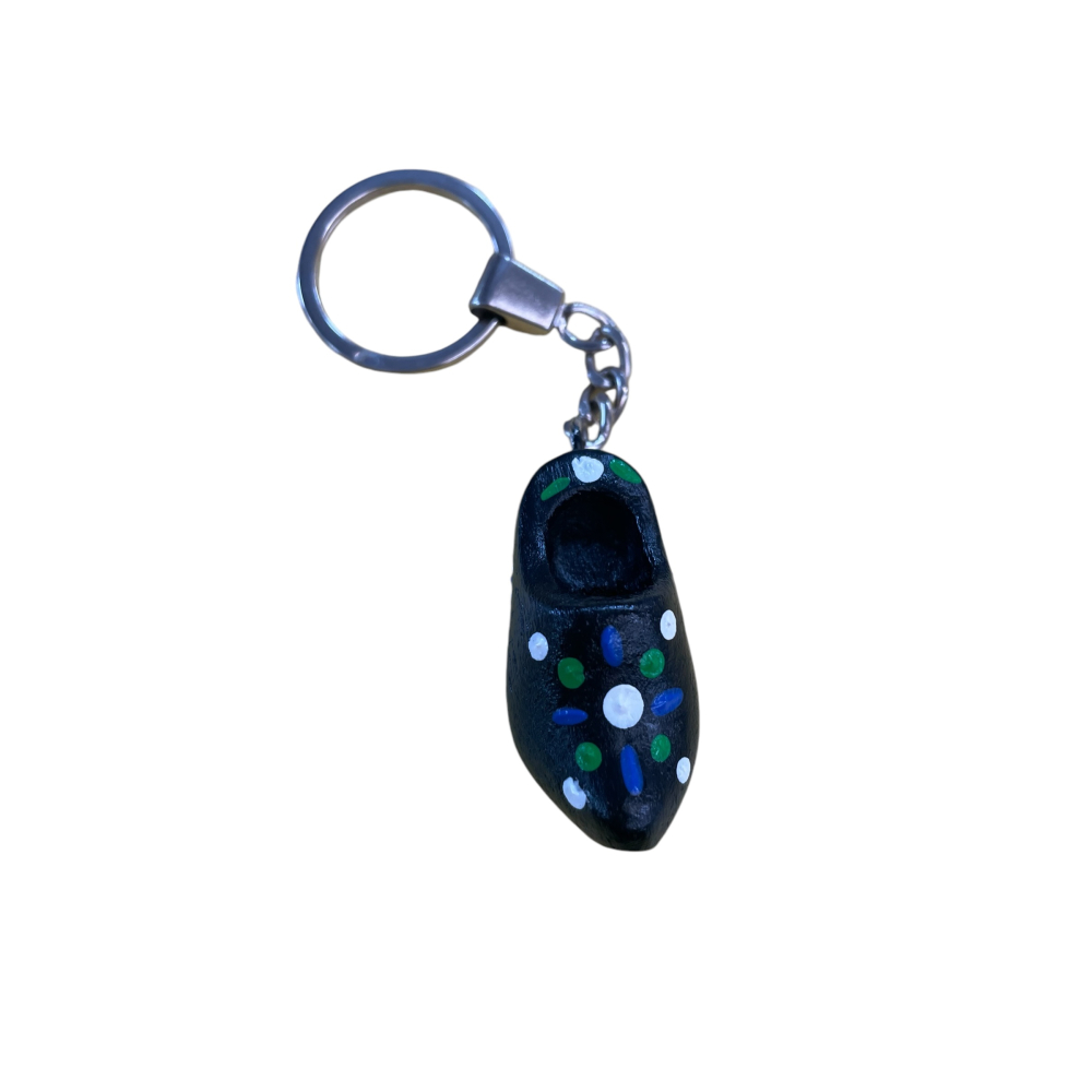 Deze stijlvolle sleutelhanger in de vorm van een klompje is een prachtig voorbeeld van traditioneel Staphorster Stipwerk. Het zwarte houten klompje is met de hand beschilderd met authentieke Staphorster stippen, waardoor elke sleutelhanger uniek is.