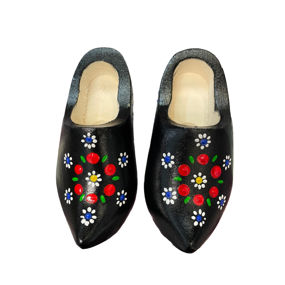 Breng een stukje Nederlandse traditie mee naar huis met deze prachtige souvenir klompjes. Deze klompjes hebben een zwarte ondergrond en zijn versierd met traditionele Staphorster stipwerkpatronen, gedrukt met stempels in diverse motieven.