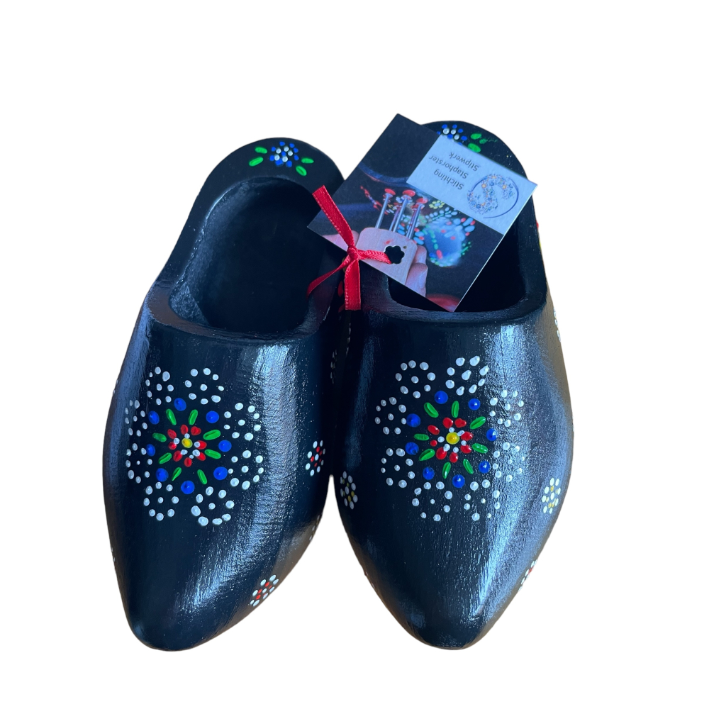 Breng een stukje Nederlandse traditie mee naar huis met deze prachtige souvenir klompjes. Deze klompjes hebben een zwarte ondergrond en zijn versierd met traditionele Staphorster stipwerkpatronen, gedrukt met stempels in diverse motieven.